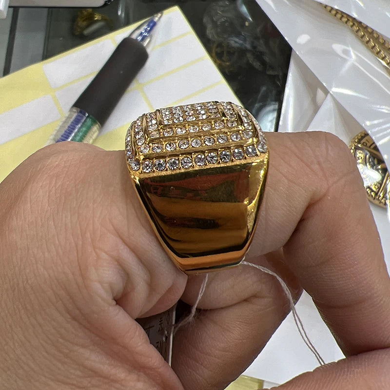 Whether you're hitting the city streets or making a statement at an event, this ring is designed to catch the eye and elevate your look. The attention-grabbing combination of stainless steel and iced-out stones makes it a versatile accessory that complements various styles and occasions.